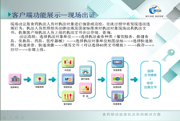 食藥移動監(jiān)督執(zhí)法系統(tǒng)是食品藥品監(jiān)督管理領(lǐng)域移動監(jiān)督執(zhí)法綜合服務(wù)系統(tǒng),主要用于食品藥品監(jiān)督管理部門移動監(jiān)管執(zhí)法使用。執(zhí)法人員可以手持客戶端現(xiàn)場檢測,錄像、錄音拍照等證據(jù)獲取,并依照法律法規(guī)對監(jiān)管對象進(jìn)行動態(tài)出證、等級評審、許可審核和日常巡檢等業(yè)務(wù)工作處理,并上報處理結(jié)果數(shù)據(jù)。監(jiān)管人員根據(jù)執(zhí)法采集的數(shù)據(jù),及系統(tǒng)自動收集到的輿情信息,實現(xiàn)了食藥監(jiān)管部門對所轄區(qū)內(nèi)的食品安全問題重點監(jiān)管工作。