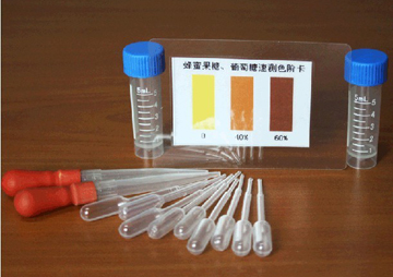 蜂蜜中的果糖和葡萄糖與顯色劑反應(yīng)生成有色化合物,采用目視比色分析方法,直接在速測(cè)色階卡上讀出果糖和葡萄糖含量。
