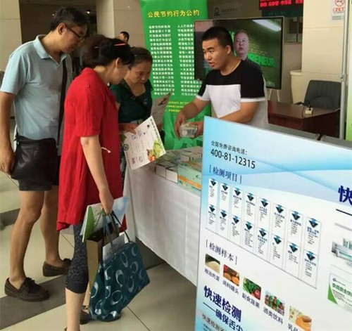 技術人員現場攜帶乳制品中蛋白質速測盒、餐飲具表面潔凈度速測盒、二氧化硫速測盒、鹽酸克倫特羅速測盒、快檢家庭套裝、水無憂速測卡、奶無憂膠體金卡、地溝油多參數快篩試劑盒等多款快檢產品,吸引了一批有一批人群圍觀,技術人員并為感興趣的做現場演示。