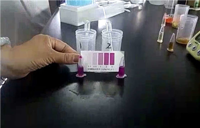 3. 10min后與標(biāo)準(zhǔn)比色卡對比,找出與速測管中溶液顏色相同的色階,該色階上的數(shù)值即為樣品中亞硝酸鹽(NaNO2計)的含量mg/L。