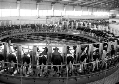 2010年12月10日,奶牛在內(nèi)蒙古蒙牛集團轉(zhuǎn)盤式自動擠奶生產(chǎn)線上等待擠奶。