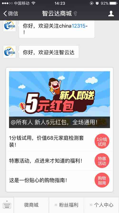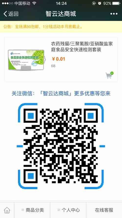 當下微信人群活躍度高,微商城的開通為消費者在隨時隨地選購食品安全快速檢測產(chǎn)品開通一條更為優(yōu)惠、方便的購物通道。那么如何在智云達商城購買產(chǎn)品?