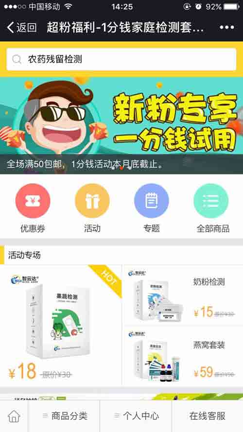 商城開業(yè)特推出一分錢試用活動,價值68元的食品安全家庭檢測套裝只要一分錢,一分錢能買到什么,你沒聽錯,可以檢測農(nóng)藥殘留、三聚氰胺、亞硝酸鹽,名額有限,檢測套裝帶回家。