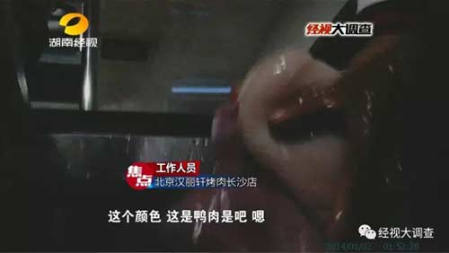 隨后,這些冰凍鴨胸肉又被偽造成牛肉,送上了餐桌,漢麗軒烤肉店的工作人員自己都聲稱不會吃。