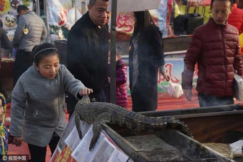 2017年1月31日,山東濱州,一燒烤攤主在春節(jié)廟會上銷售現(xiàn)烤現(xiàn)賣的鱷魚肉。廟會上,各類烤肉串、羊肉串已經(jīng)不鮮見,但烤鱷魚肉不少趕廟會的人還是第一次見,許多市民爭相嘗鮮。為了吸引顧客,攤主擺了張著大嘴的整條鱷魚當招牌。