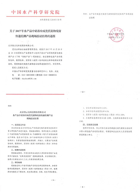 中國水產(chǎn)科學(xué)研究院質(zhì)量與標(biāo)準(zhǔn)研究中心受農(nóng)業(yè)部漁業(yè)漁政管理局委托 ,運(yùn)用智云達(dá)自主研發(fā)的水產(chǎn)品快檢產(chǎn)品,對水產(chǎn)品中硝基呋喃類代謝物進(jìn)行快速檢測。2017年10月23日-24日,該檢測在國家水產(chǎn)品質(zhì)檢中心順利開展。驗(yàn)證結(jié)果如下: