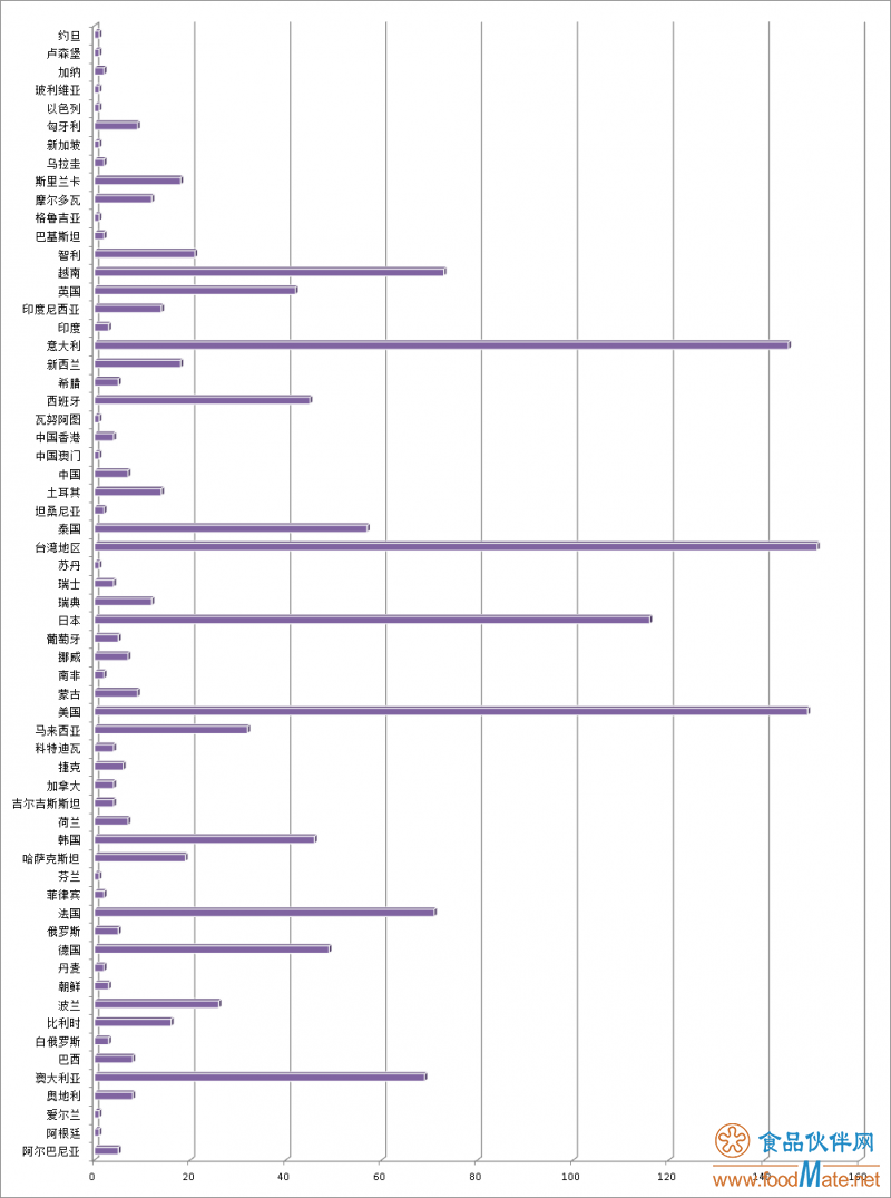 統(tǒng)計(jì)顯示,這些食品來自六十多個(gè)國家或地區(qū)。其中,意大利、美國、日本這些國家以及臺(tái)灣地區(qū)的不合格食品居多,尤以臺(tái)灣地區(qū)的最多。