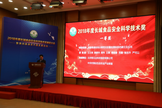 北京智云達科技股份有限公司的"真菌毒素時間分辯熒光定量檢測體系的建立及應用"榮獲了長城食品安全科學技術獎一等獎。中國工程院院士李德發、中國工程院院士趙春江給一等獎獲得者頒發了證書。 我司的王文珺博士代表智云達獲獎團隊上臺接受了李德發院士頒發的證書。