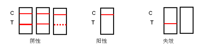 無(wú)效反應(yīng):C線不顯色,無(wú)論T線是否顯色,該檢測(cè)卡均判為無(wú)效。未出現(xiàn)C線,表明操作過(guò)程不正確或檢測(cè)卡已變質(zhì)失效。在此情況下,應(yīng)再次仔細(xì)閱讀說(shuō)明書,并用新的檢測(cè)卡重新測(cè)試。