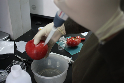 1、  滴 2-3 滴農殘洗脫液在西紅柿表面表面。