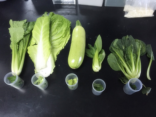 然后對所有蔬菜進(jìn)行取樣,各取2g表皮或者外層葉子(這些往往是噴灑農(nóng)藥接觸較多的地方);