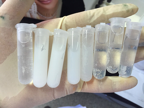 首先針對這八種樣品進行分別前處理,面膜類的直接擠壓,吸取擠壓得到水樣1ml轉移到5ml離心管中;粉餅加入3ml有機溶劑到粉餅中,再擠壓粉餅得到1ml樣本液轉移到5ml離心管中;乳狀或者膏狀樣品直接稱量1g轉移到有機溶劑中進行溶解,對溶解液進行過濾,轉移1ml濾液到5ml離心管中。