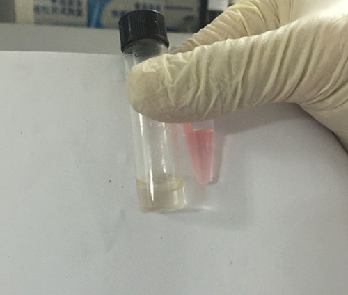 此樣品溶液較為渾濁,因此判定水分指標為陽性。三項指標中有一項不符,判定此油樣為地溝油。