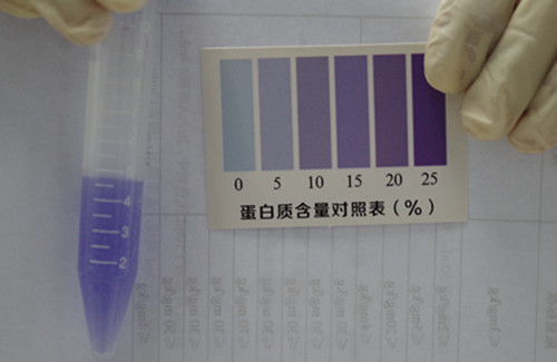 取4 mL顯色液加入比色管中,蓋上蓋,用力將奶粉全部搖溶,顯色3分鐘,在3~5分鐘內(nèi)將比色管襯在白紙上與標(biāo)準(zhǔn)比色卡進(jìn)行對比,找出與乳粉蛋白質(zhì)標(biāo)準(zhǔn)比色卡上相近的色階,即為每100g乳粉樣品中蛋白質(zhì)的含量。