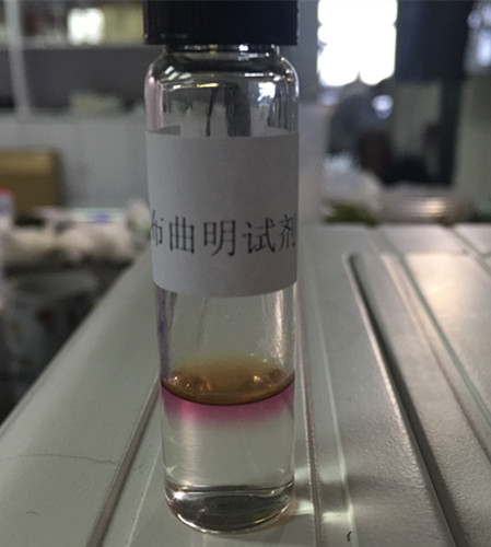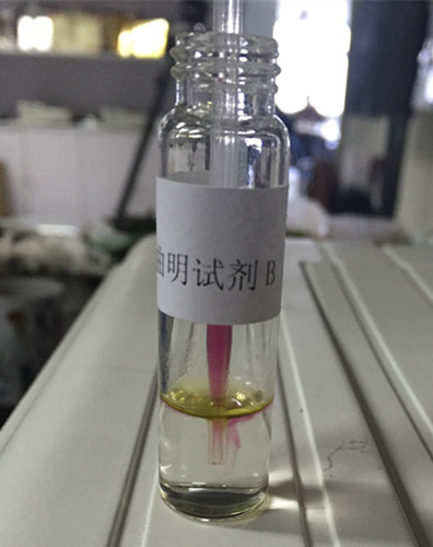 1 min后,B瓶下層溶液產(chǎn)生渾濁或沉淀,可判定含有西布曲明,即為陽性(+);無沉淀則判為陰性(-);結(jié)果顯示樣品下層溶液澄清,初步判定不含有西布曲明。