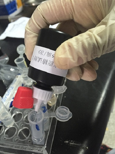 用0.2 mL塑料吸管取待測液滴加1滴到另一離心管中,滴入15滴蔗糖試劑1,蓋上管蓋,上下?lián)u動6次。