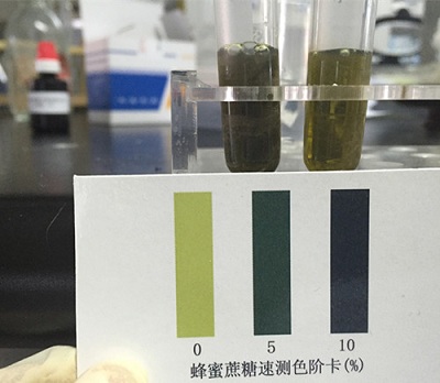 把離心管放入沸水浴中加熱5分鐘,取出與比色卡比對,讀出樣品中蔗糖的含量(%)。根據(jù)國家標(biāo)準(zhǔn)規(guī)定,桉樹蜂蜜、柑橘蜂蜜、紫苜蓿蜂蜜、荔枝蜂蜜、野桂花蜜中蔗糖應(yīng)≤10 g/100 g,其他蜂蜜應(yīng)≤5 g/100 g。結(jié)果顯示樣品中蔗糖含量符合國家標(biāo)準(zhǔn)。