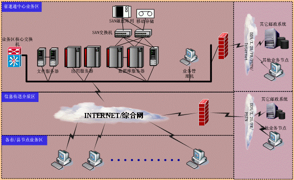 (2)INTERNET/郵政綜合網(wǎng):本系統(tǒng)的建設(shè)將緊密結(jié)合現(xiàn)有網(wǎng)絡(luò)覆蓋面廣的資源優(yōu)勢,構(gòu)建起全新一代的互聯(lián)網(wǎng)應(yīng)用。